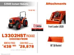 This L3302HST package includes a LA525 Front Loader & 66″ QA Bucket! Call 814-266-3171 for more info!