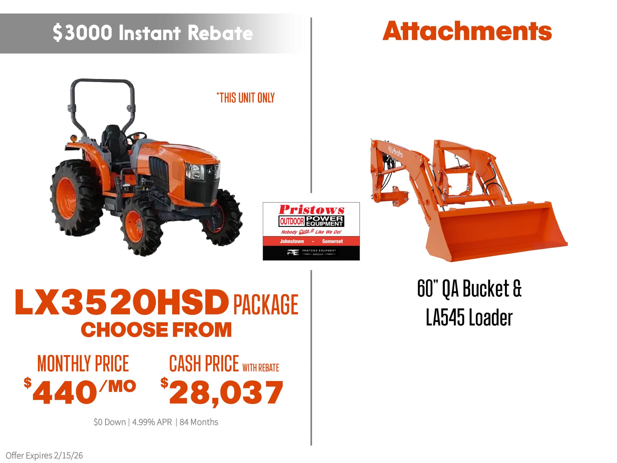 This LX3520HSD package includes a LA545 Front Loader & a 60″ QA Bucket! Call 814-266-3171 for more info!